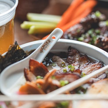 - Seared pork belly, ramen eggs, marinated bamboo sprouts, fish cake, scallions, and crispy nori strips.